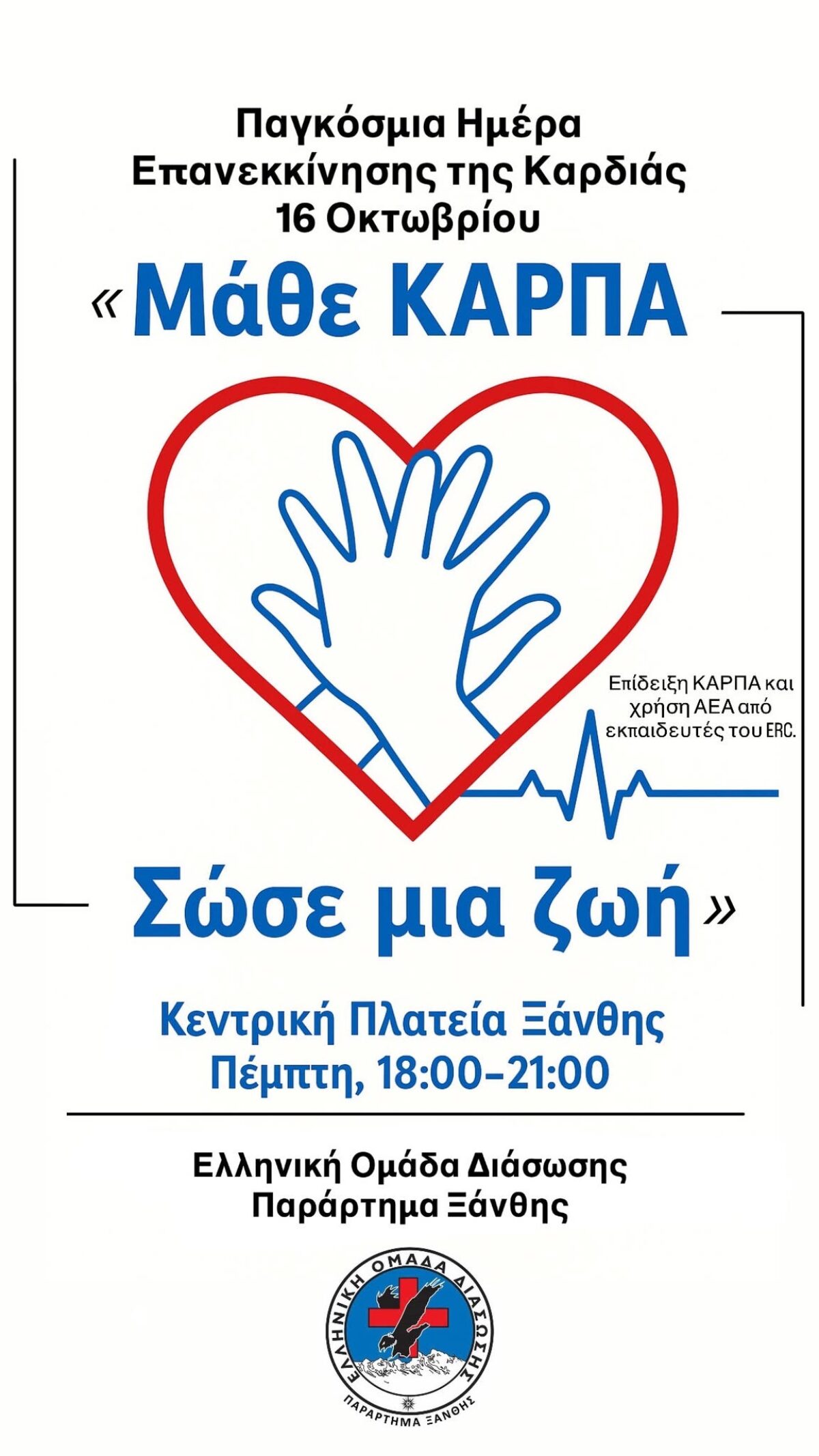Η Ελληνική Ομάδα Διάσωσης Παράρτημα Ξάνθης – Hellenic Rescue Team of Xanthi πήρε την πρωτοβουλία να δείξει την τεχνική της ΚΑΡΠΑ στους συμπολίτες μας. Η επίδειξη σκοπό είχε να φέρει κοντά τους συμπολίτες μας με τη ΚΑΡΠΑ. Δεν ακολουθήθηκε κατά γράμμα το πρωτόκολλο και η εκπαίδευση. Και αυτό δεν θα ήταν δυνατόν αφού στις 3 ώρες είχαμε 43 επισκέψεις από πολίτες που έδειξαν ενδιαφέρον. Δεν τηρήθηκαν τα ΜΑΠ από τους εκπαιδευτές και τους ” εκπαιδευομενους”. Βεβαία δόθηκε ιδιαίτερη έμφαση στα ΜΑΠ και γι’αυτό σε κάθε πολίτη που προσπάθησε δόθηκε μια μάσκα CPR. Ο σκοπός μας επιτεύχθηκε. Οι συμπολίτες μας ήρθαν λίγο πιο κοντά στις πρώτες βοήθειες. Το συγκλονιστικό της όλης παρουσίασης ήταν από τη πρώτη κυρία που μας ήρθε στο σημείο μας. Μετά την επίδειξη και τη δική της προσπάθειας μας ανέφερε “αν γνώριζα 20 χρόνια νωρίτερα μπορεί να είχα σώσει το πατέρα μου”….