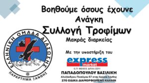Η Ελληνική Ομάδα Διάσωσης παράρτημα Ξάνθης σε συνεργασία με το κατάστημα EXPRESS MARKET Παπαδοπούλου Βασιλική συλλέγει τρόφιμα στο ειδικά διαμορφωμένο καλάθι εντός του καταστήματος στη Αλεξάνδρου Παπάγου 57 στη Χρύσα Ξάνθης.